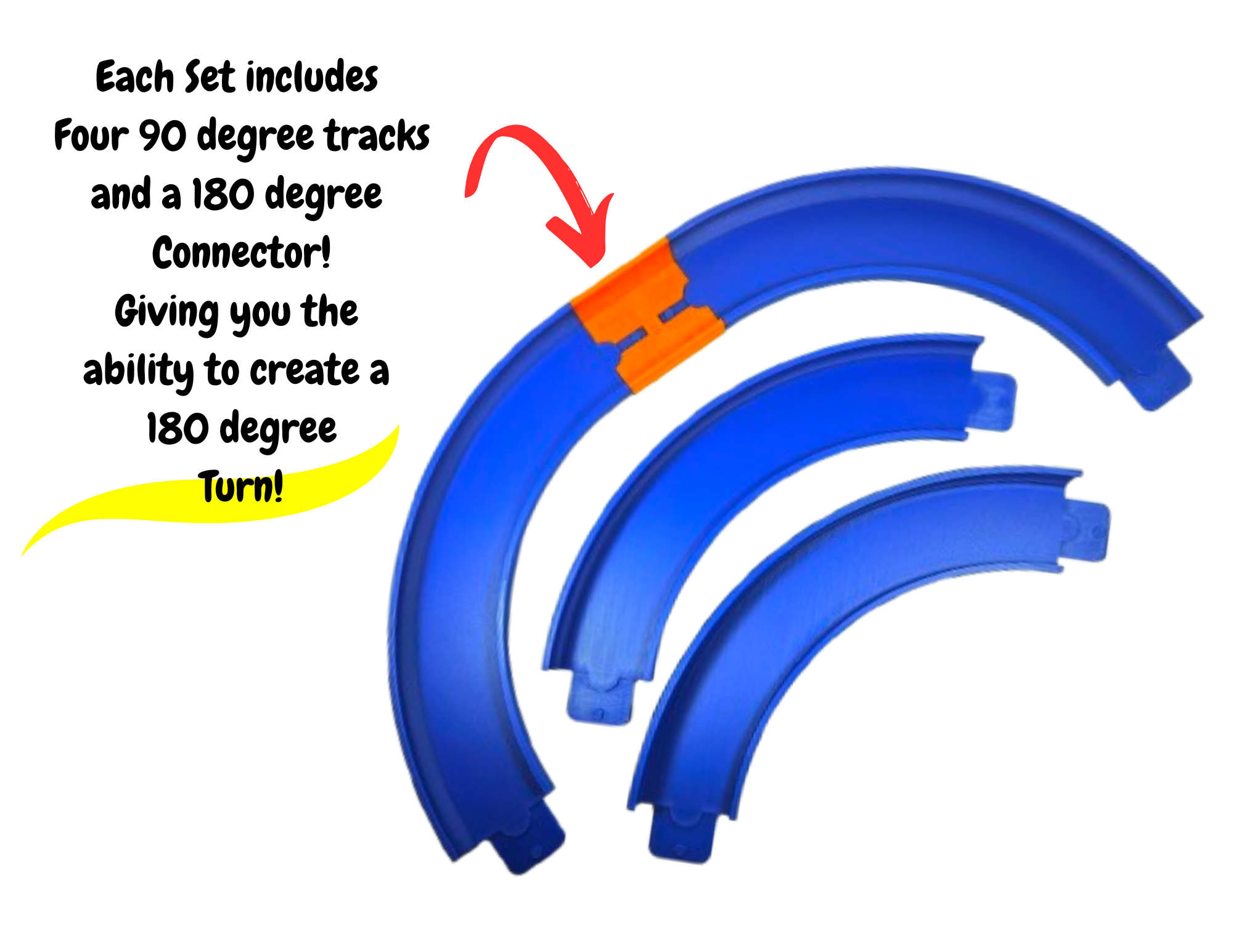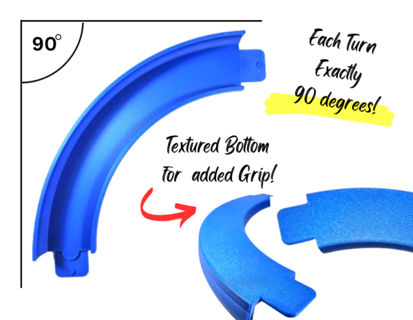 COMPATIBLE WITH HOTWHEELS RACING TRACKS – Our 90 degree curved tracks are compatible with Hot Wheels Racing tracks providing a fun and unique experience for Toy Car enthusiasts. Each set includes four 90 degree tracks and a bonus 180 degree connection allowing you to create a 180 degree turn. THE BONUS 180 CONNECTION IS ONLY INCLUDED WITH A SET OF 4 PURCHASE.