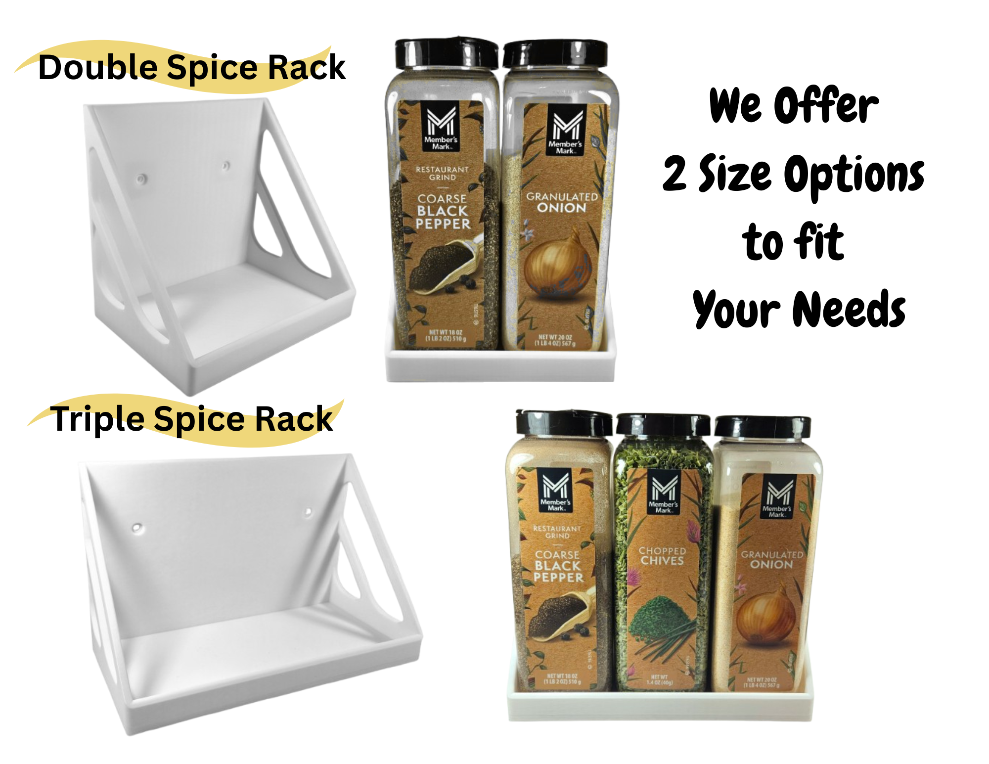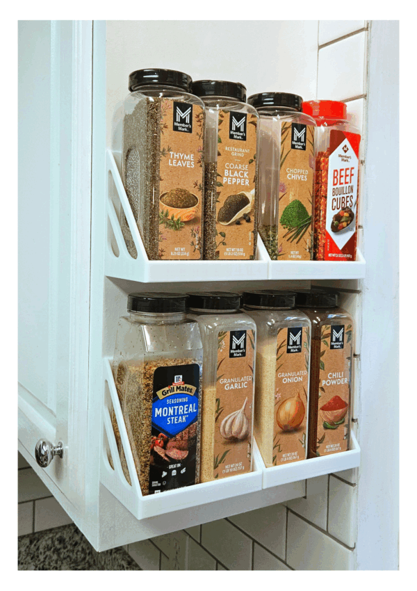 EXTRA LARGE SPICE RACK – Each of our spice racks holds 2 of the oversized spices commonly sold at Sam’s Club or the Extra Large Containers purchased at a variety of stores.
