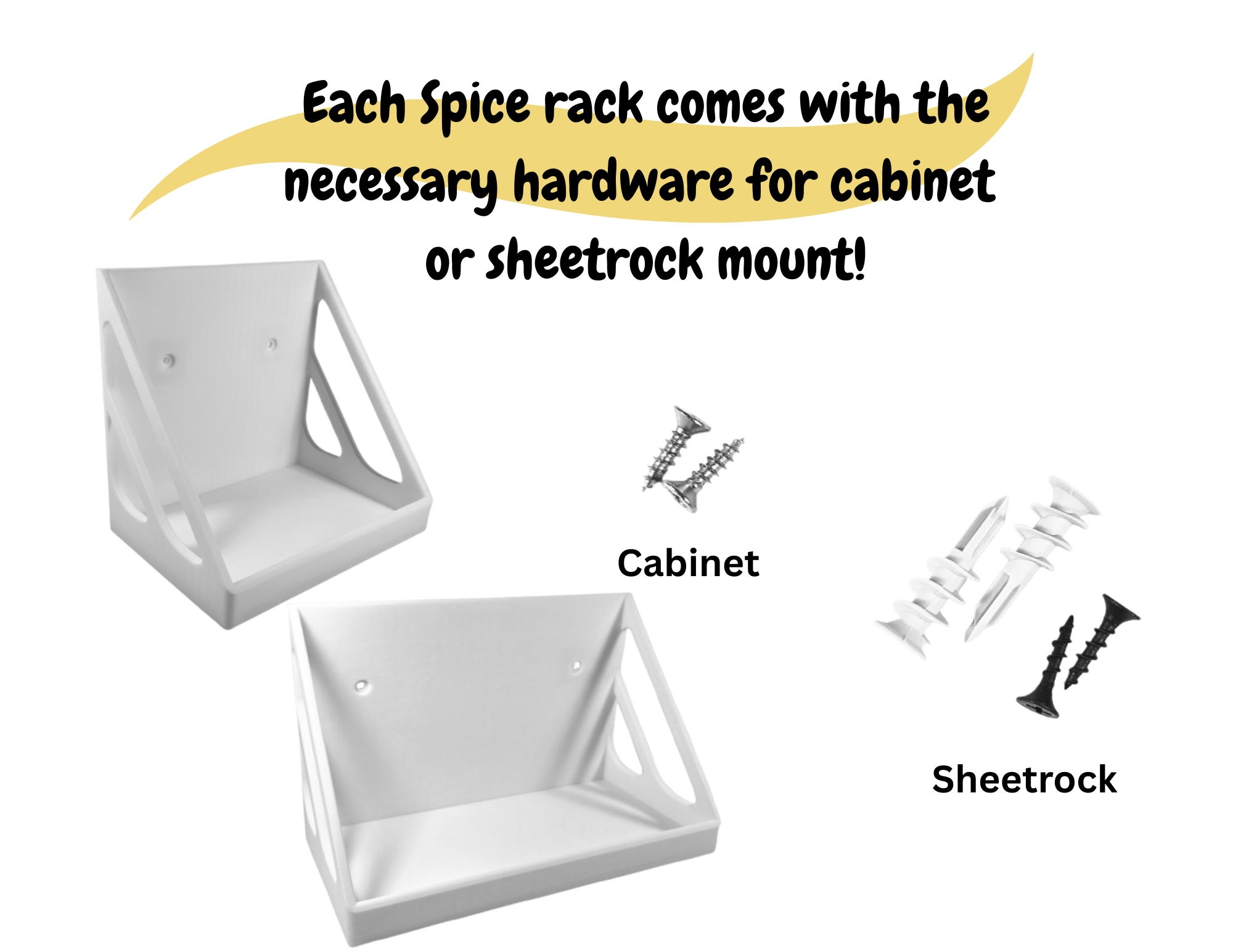 MOUNTING HARDWARE INCLUDED – We have included the mounting hardware necessary for each spice rack. Each spice rack includes 2 wood screws for a cabinet mount along with 2 sheetrock screws and 2 anchors for a sheetrock wall mount.